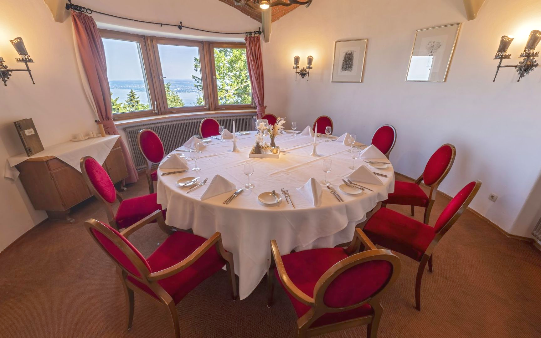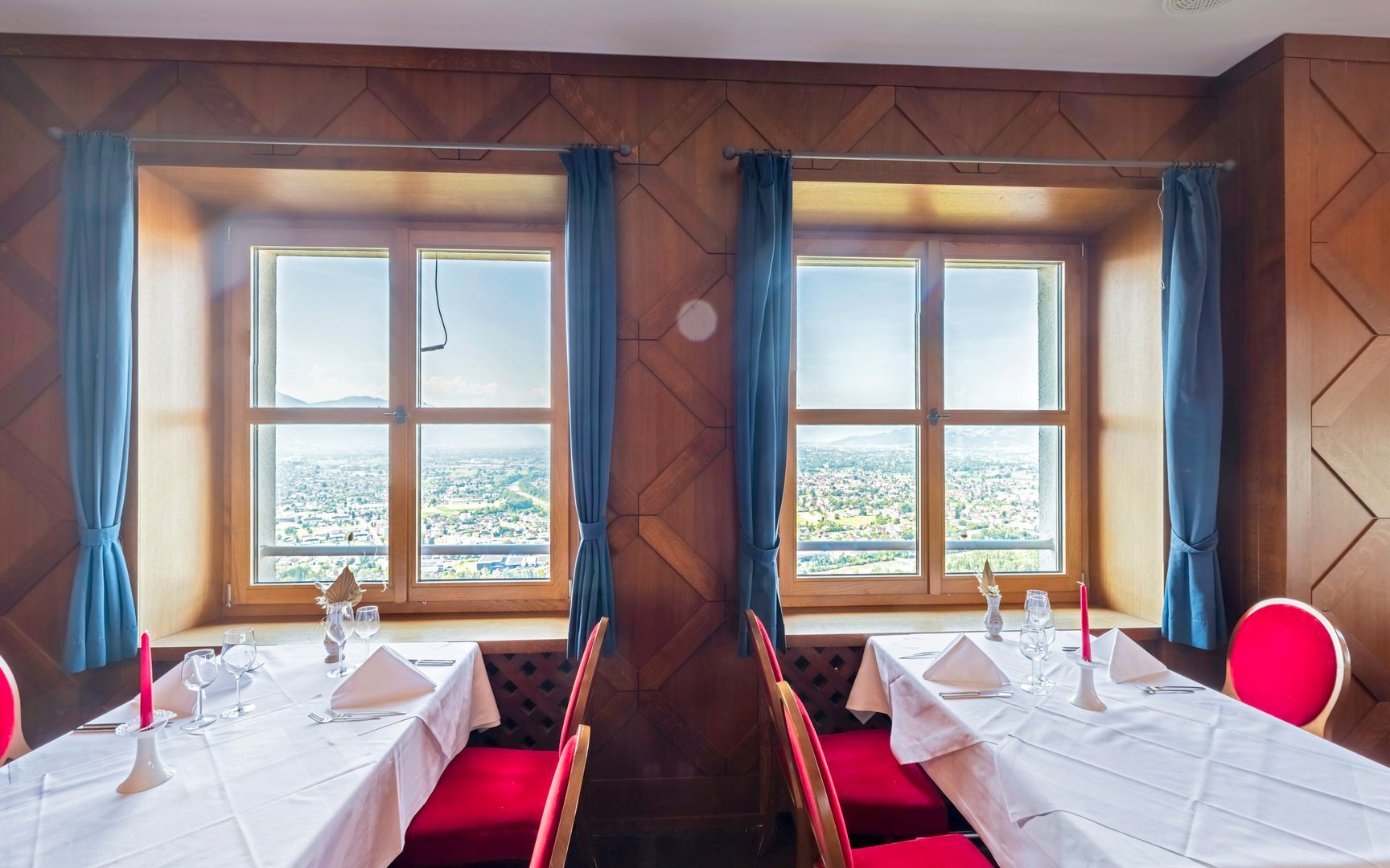 Die Habsburgstube ist der stilvolle, abgetrennte Teil des Montfortsaals – ein Raum mit viel historischem Flair und einem der schönsten Ausblicke auf das Rheintal und den Bodensee.