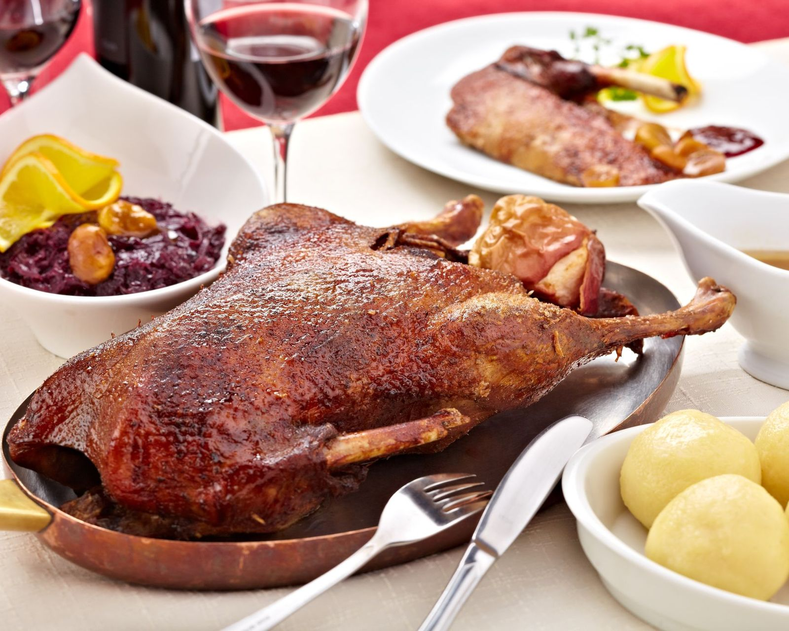 mit Apfel-Rotkraut · Sprossenkohl · Serviettenknödel
